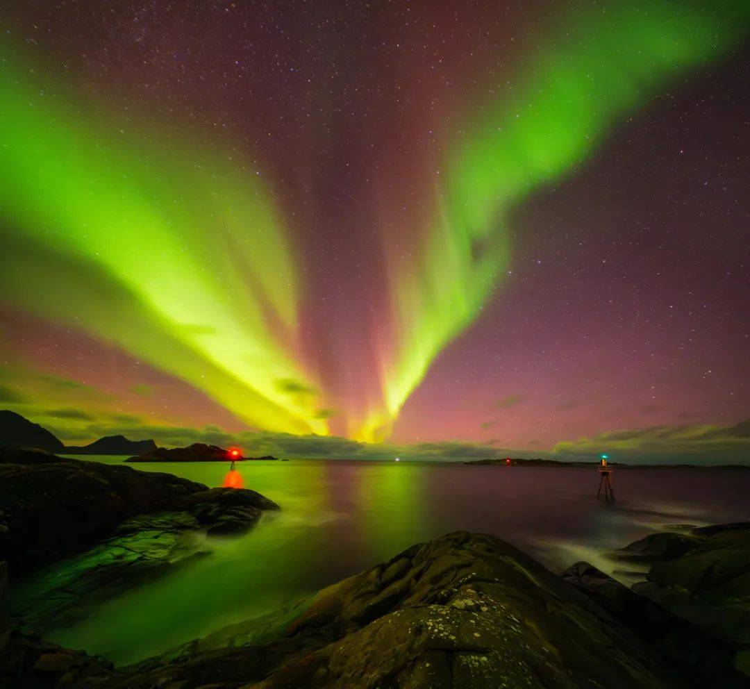 极光的形成与太阳活动和地球磁场密切相关。太阳不断向外释放带电粒子,形成太阳风。当太阳风中的带电粒子到达地球附近时,会被地球的磁场捕获。地球磁场像一个巨大的漏斗,将带电粒子引导至南北两极地区,与高层大气中的氧、氮等气体分子发生碰撞。
