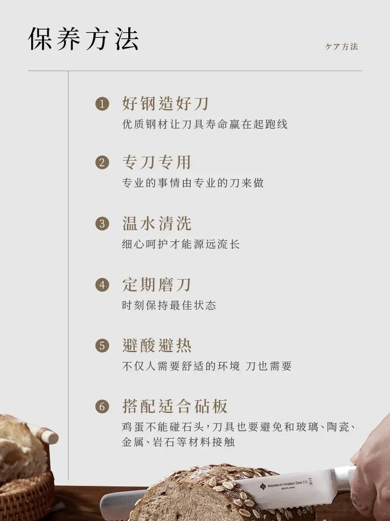 规避错误用法,从源头保护刀具很多人会用菜刀砍骨头、撬瓶盖,这些行为会严重损伤刀刃和刀身。砍骨需要专用斩骨刀,其刀身更厚重、韧性更强;普通切片刀、水果刀仅适合切菜、切肉、削水果。另外,刀具不要高温烘干或放在消毒柜高温层,高温会让刀身金属发生变化,影响硬度和寿命。