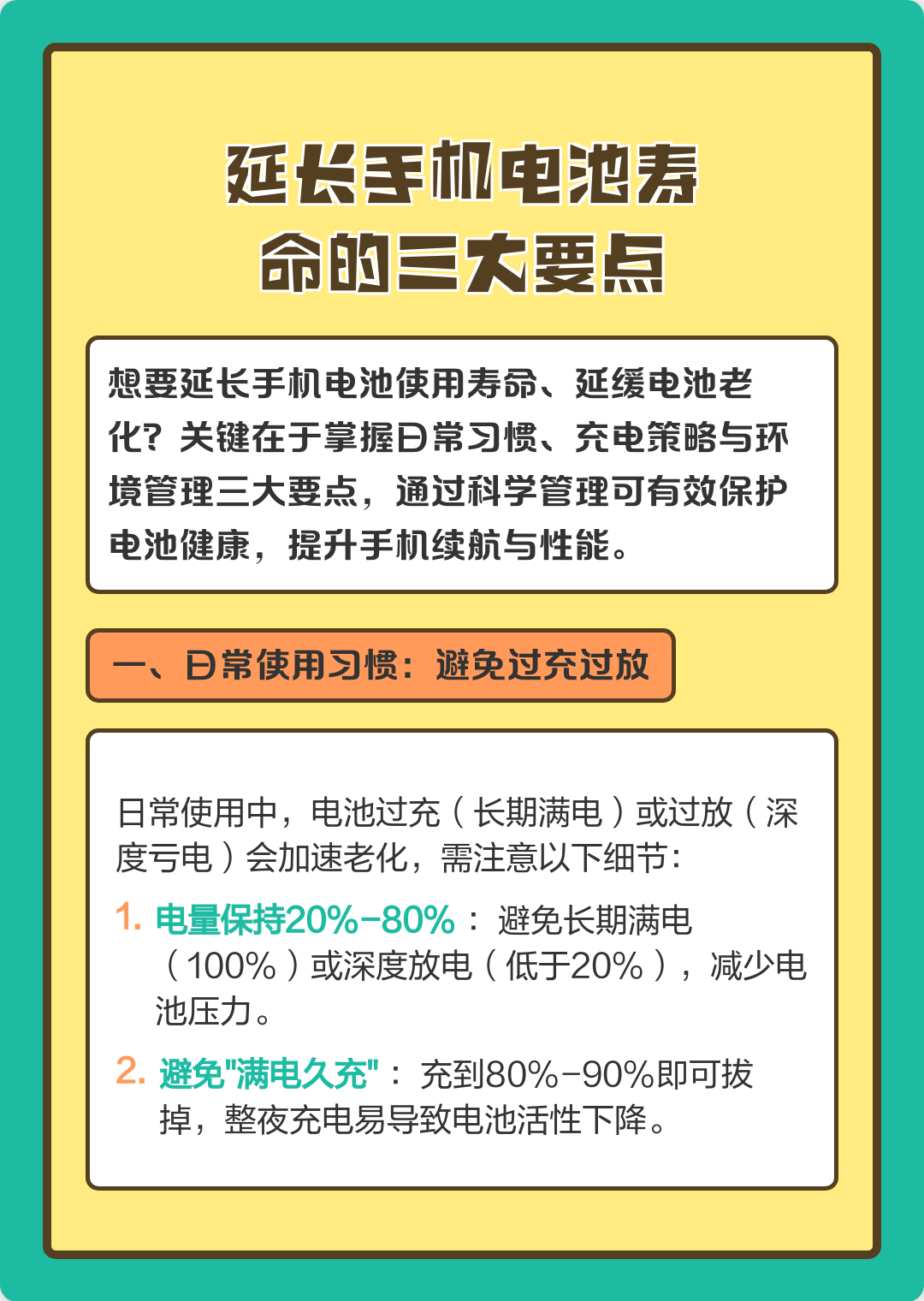 其次,做好手机电池的保养。避免过度充电和过度放电,手机电量充至80%-90%即可拔掉充电器,不要等到电量完全耗尽后再充电,这样会损伤电池寿命。避免在高温或低温环境下使用手机,高温会加速电池老化,低温会影响电池的性能。另外,不要边充电边使用手机,边充电边使用手机会产生大量的热量,损伤电池和手机内部部件。