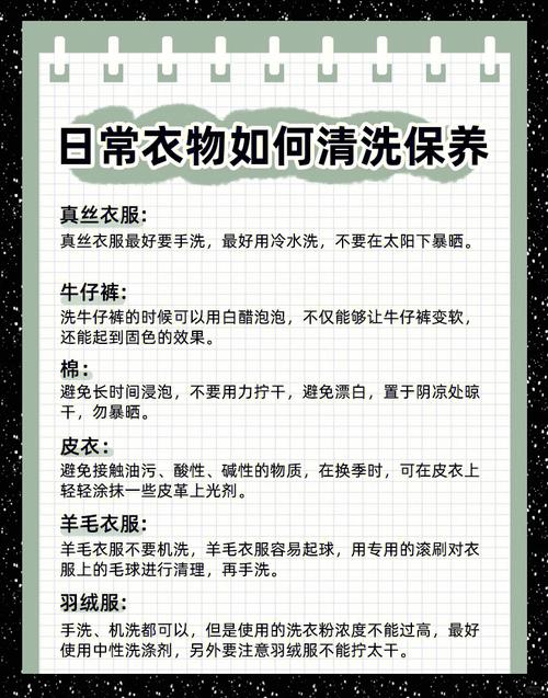不同材质的衣物,清洗和晾晒方式也不同。棉质衣物吸水性强,清洗时可轻轻搓揉,避免用力拉扯,防止变形;清洗后不要用力拧干,可将衣物平铺在毛巾上,包裹毛巾轻轻按压,吸干水分,再进行晾晒。羊毛、羊绒衣物质地柔软,容易起球、变形,不宜用洗衣机清洗,建议手洗,手洗时用温水和专用羊毛洗涤剂,轻轻按压清洗,不要搓揉,清洗后平铺晾干,避免悬挂晾晒,悬挂会导致衣物变形拉长。丝绸衣物质地轻薄、娇贵,容易受损,清洗时要用冷水和温和的丝绸洗涤剂,轻轻漂洗,不要用力搓揉,清洗后用毛巾吸干水分,平铺在通风阴凉处晾干,避免阳光直射,阳光直射会导致丝绸衣物褪色、发黄、变脆。