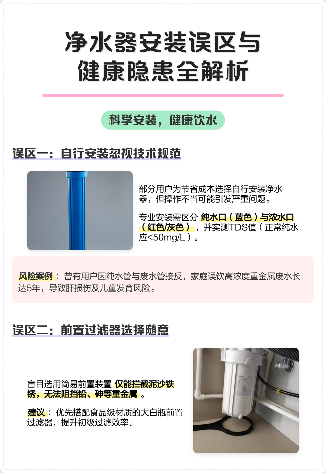 随着人们生活水平的提高,对饮水健康越来越重视,家用净水器已经成为很多家庭的“必备家电”。很多人认为,安装了净水器,就相当于拥有了“健康保护伞”,无论自来水有多脏,经过净水器过滤后,都能变成“直饮水”,可以放心饮用;还有人盲目追求高价净水器,认为价格越高,过滤效果越好。其实,家用净水器并不是“万能的”,它有自己的过滤范围和使用限制,很多人因为陷入了使用误区,不仅没有喝到健康的水,还浪费了钱,甚至损伤了身体健康。今天就来科普家用净水器的相关知识,帮大家避开常见误区,正确使用净水器,守护家人的饮水健康。