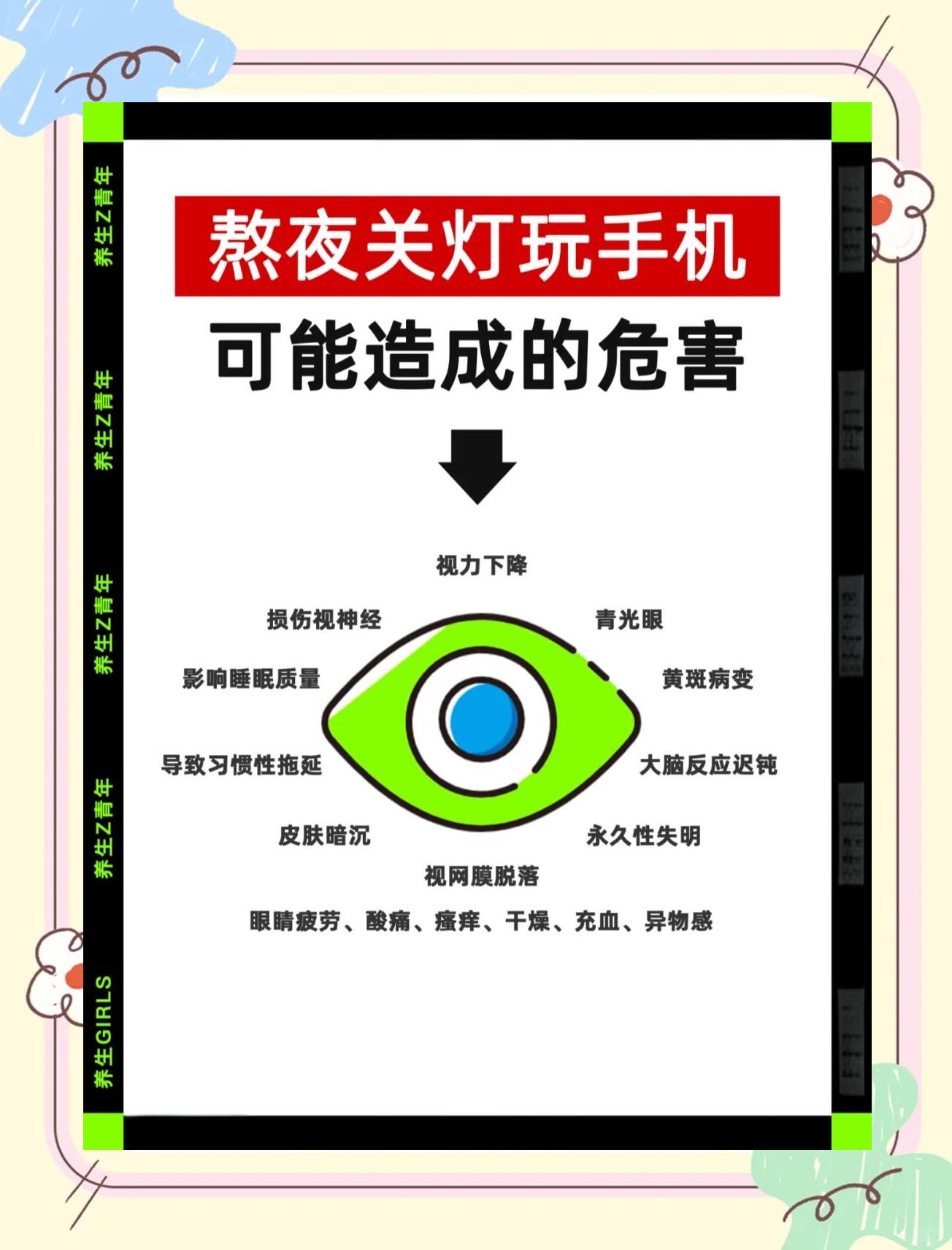 长期熬夜玩手机,最直观的伤害就是损伤眼睛,这一点很多人都有体会,熬夜后会出现眼睛酸胀、干涩、视物模糊、黑眼圈、眼袋等症状,长期下来,会加重近视、引发干眼症,甚至损伤视网膜,导致视力下降,这些伤害我们之前已经科普过,但除了伤眼睛,还有更致命的伤害,被很多人忽视。