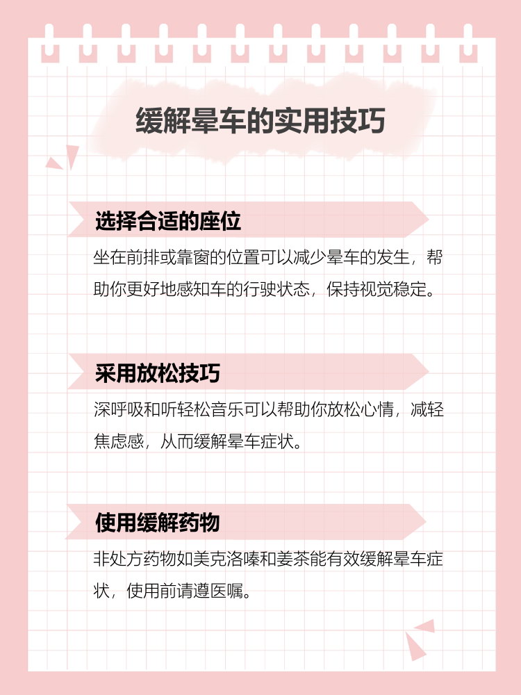 出行前做好准备,是应对晕车的关键,很多人晕车,都是因为出行前准备不足,导致不适症状加重。小技巧:出行前不要空腹,也不要吃得太饱,空腹坐车容易出现低血糖,加重晕车症状,吃得太饱,车辆颠簸时,肠胃蠕动加快,容易出现恶心、呕吐,出行前半小时到一小时,吃一些清淡、易消化的食物,比如面包、馒头、水果等,七分饱即可;出行前保证充足的睡眠,不要熬夜,熬夜会让身体疲劳,免疫力下降,更容易出现晕车症状,充足的睡眠能让身体保持良好的状态,减少晕车的可能性;出行前不要喝酒、吸烟,酒精和尼古丁会刺激肠胃和神经,加重晕车症状,影响出行体验。