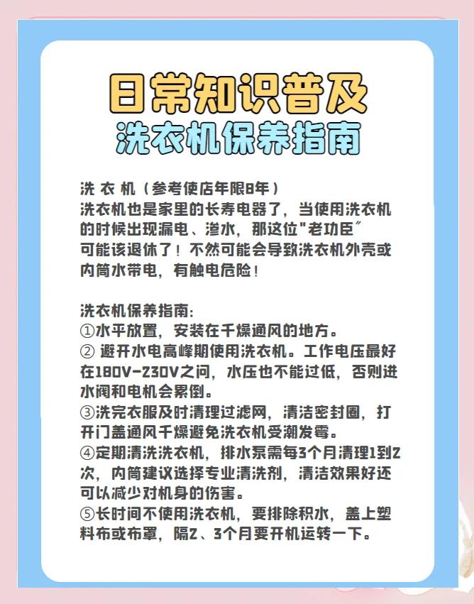 定期维护能延长家电使用寿命、降低安全风险。空调:每年清洗1-2次滤网和散热片,避免积尘过多导致过热,雨季过后检查线路绝缘情况;冰箱:定期清理冷凝器灰尘,保持散热良好,避免靠近热源;洗衣机:定期清理滤网,防止毛发堵塞,每年检查电源线是否破损;电热水器:每1-2年清理内胆水垢,检查防电墙是否正常。